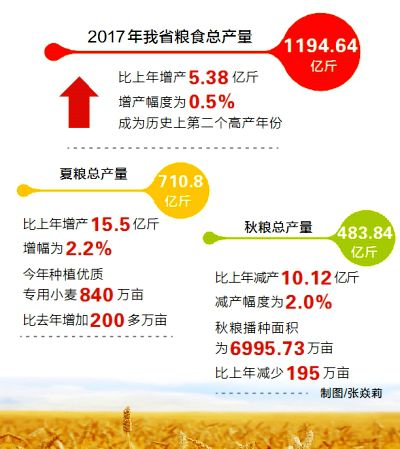 国家统计局河南调查总队发布消息,根据该总队调查,并经国家统计局核定,2017年我省粮食总产量为1194.64亿斤,比上年增产5.38亿斤,增产幅度为0.5%,成为历史上第二个高产年份。